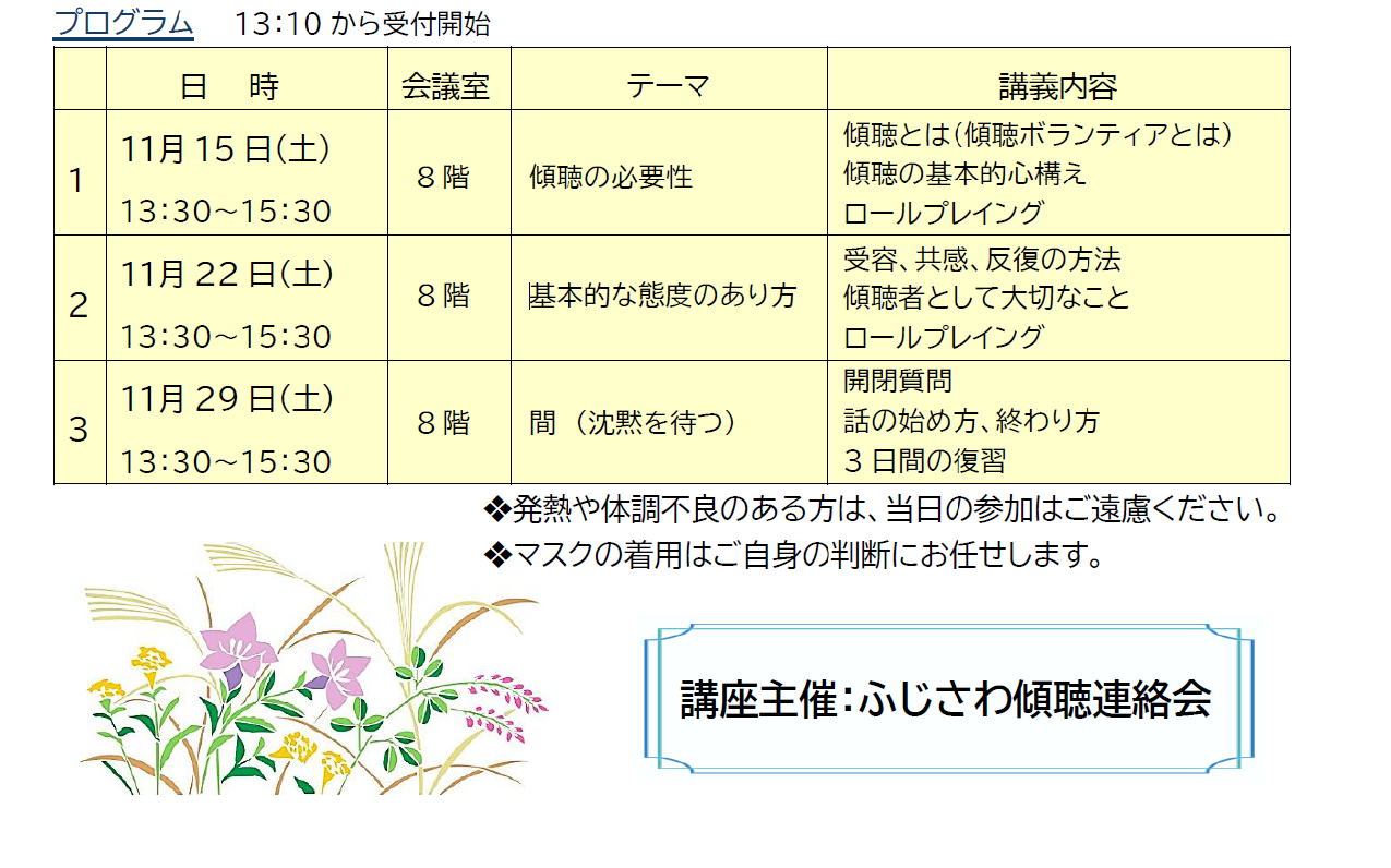 ![]() 受講を希望される皆様へ 傾聴の基礎を、様々な角度から学習し、ロールプレイを通して、実践的な力をつけて行きます。 2023年(令和5年度)の入門コースは、終了しました。